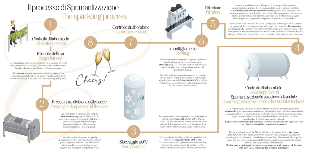 Every vineyard row is cared for daily with precision: manual harvesting, natural cycle respect, and sustainable agriculture practices are the pillars of our philosophy. We employ the long Charmat method, a technique that involves slow re-fermentation in steel tanks to preserve and enhance the wine’s natural aromas, resulting in fine and persistent bubbles.